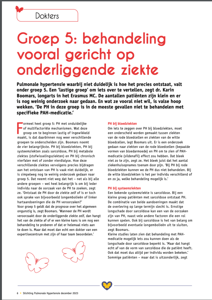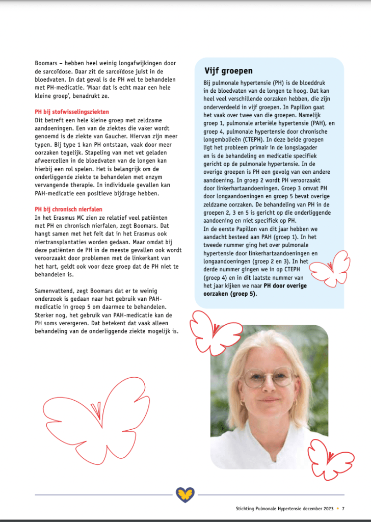 Louise Bouman, President of the Dutch Pulmonary Hypertension association, shared this article from the end-of-year edition of the association’s magazine “Papillon”. The article is about one of the five pulmonary hypertension groups classified by the World Health Organisation (WHO). Louise has also very kindly provided us with an English translation (see bottom of page for text in original language). Very big thank you Louise!