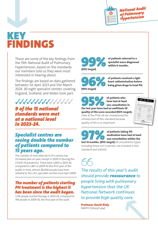The audit is commissioned by NHS England, and supported by NHS Scotland, NHS Wales, and the National Pulmonary Hypertension Centres of United Kingdom and Ireland Physicians’ Committee. The UK Pulmonary Hypertension Associations also plays a key role in the audit. It funded its first year in 2009, and every year it brings the community the key findings in a clear and accessible way – in the form of a report (link). It also continues to provide input into the development of the audit, influencing it to be of maximum benefit to patients.